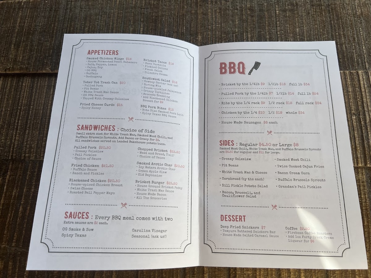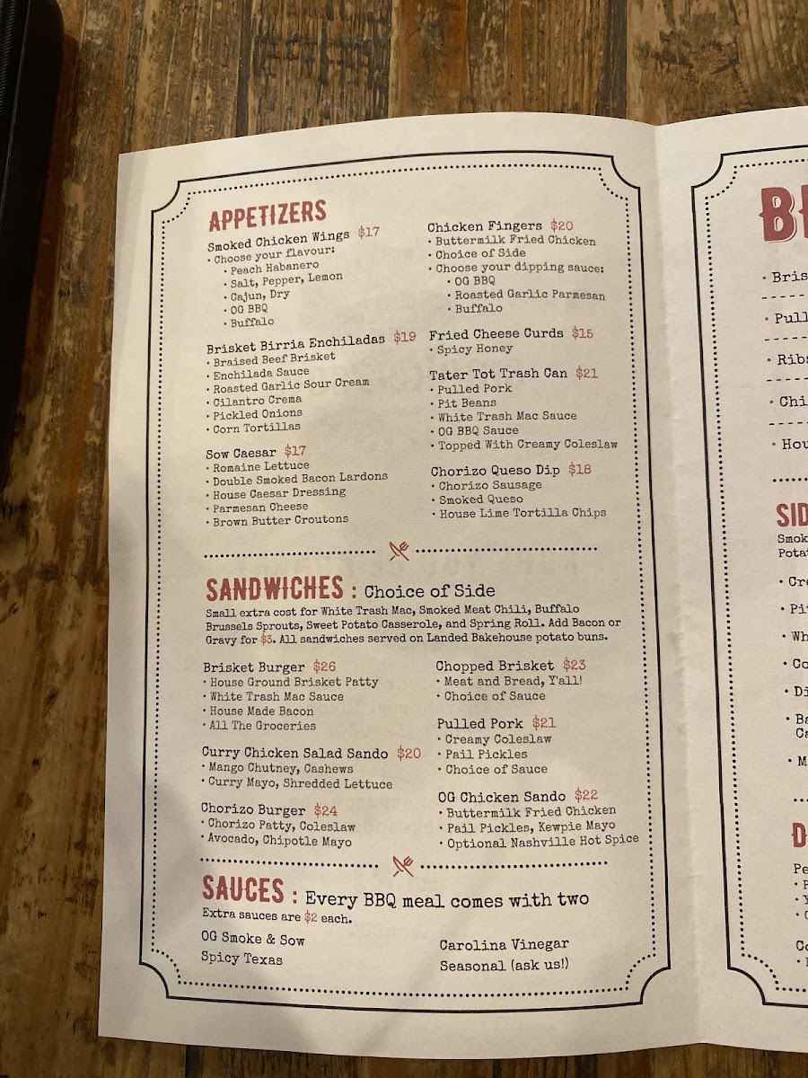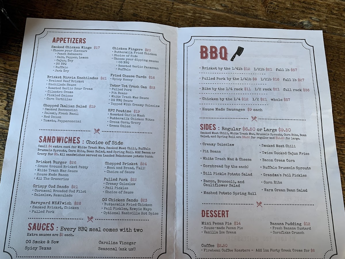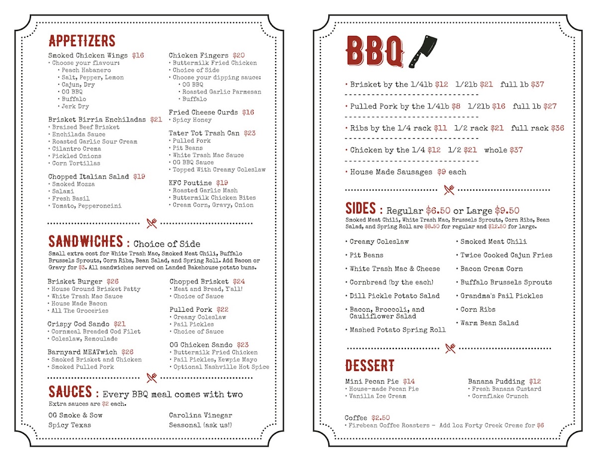 The menu at Smoke & Sow offers a delicious mix of smoked meats, flavorful sides, and refreshing drinks, perfect for a satisfying meal. Starting with appetizers, guests can enjoy Smoked Chicken Wings, Brisket Birria Enchiladas, and a fresh Chopped Italian Salad, alongside comfort food options like Chicken Fingers and Fried Cheese Curds. For sandwiches, the Brisket Burger and Crispy Cod Sando are standout choices, while the Barnyard Meatwich, featuring a combination of Chopped Brisket and Pulled Pork, brings a smoky punch. The BBQ section features hearty portions of Brisket By The 1, Pulled Pork By The 1, Ribs By The 1/4, and tender Chicken By The, as well as House Made Sausages. Sides like Creamy Coleslaw, Pit Beans, and Twice Cooked Cajun Fries complement the main dishes, and the Bacon Cream Corn is a fan favorite. For dessert, indulge in a Mini Pecan Pie or Banana Pudding for a sweet finish. The drinks menu offers local and craft beer options, such as Winterlong Pingo and Yukon Brewing Bohemian Pilsner, along with an assortment of cocktails like the Maple Bourbon Smash and Lavender Collins. Whether you're in the mood for BBQ or a refreshing drink, Smoke & Sow's menu is sure to satisfy every craving.