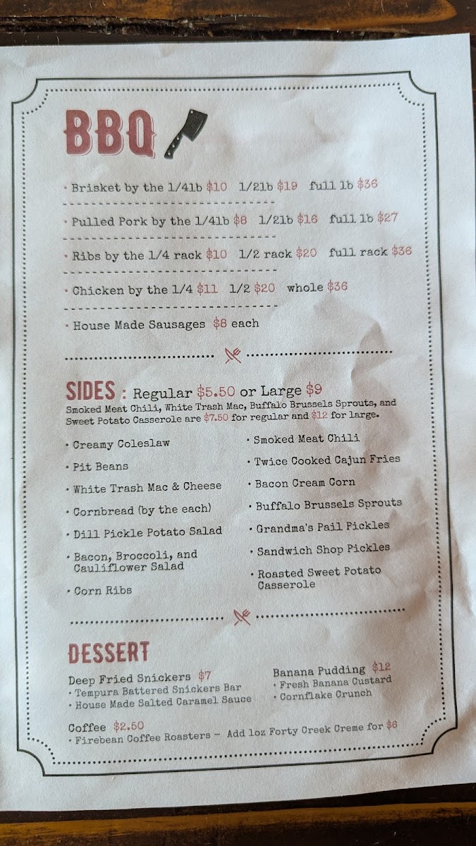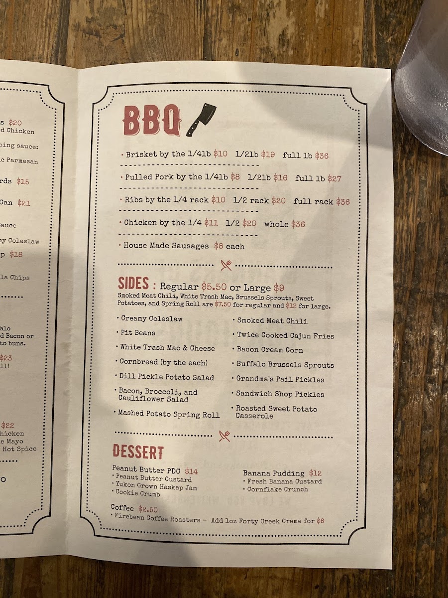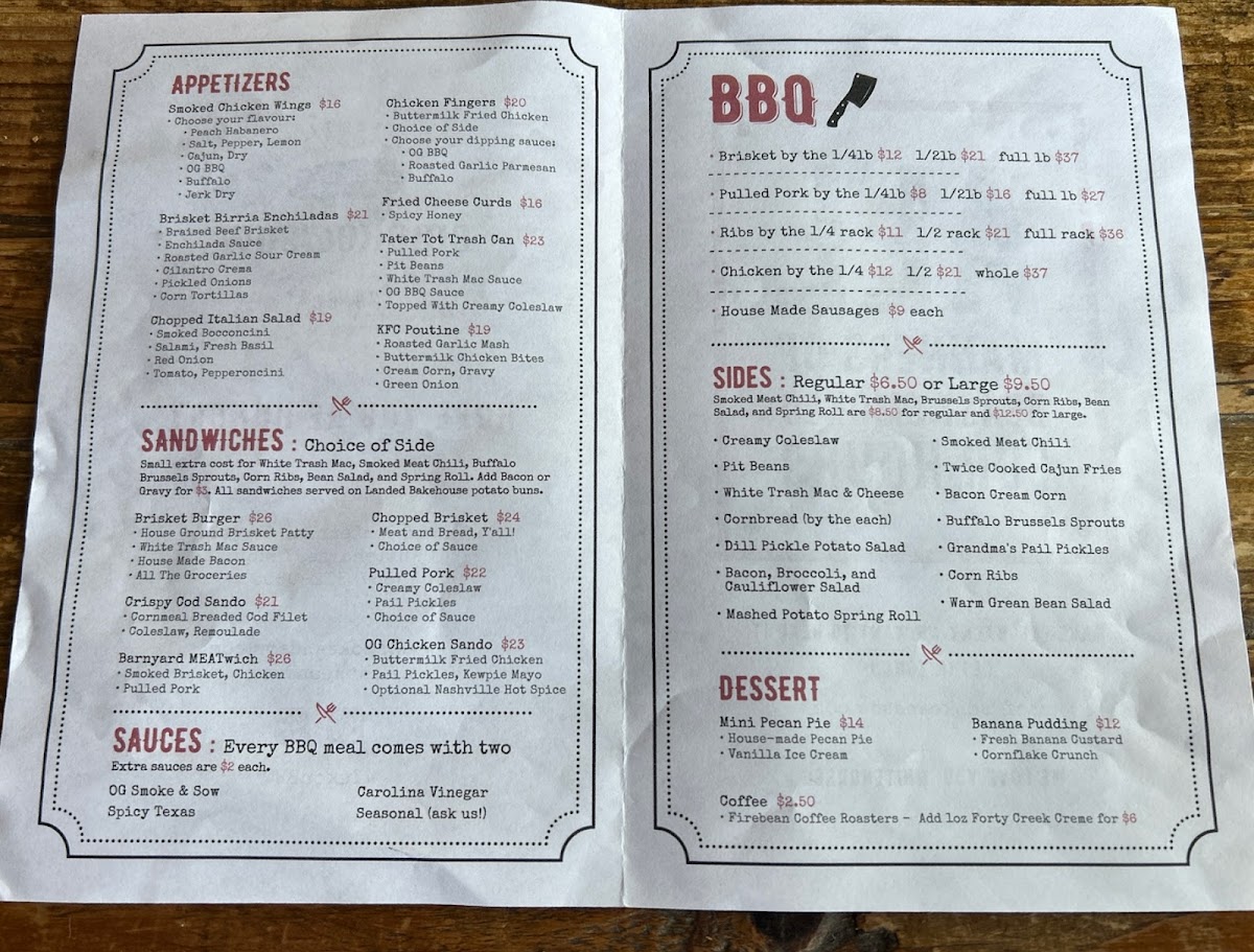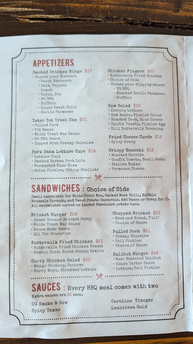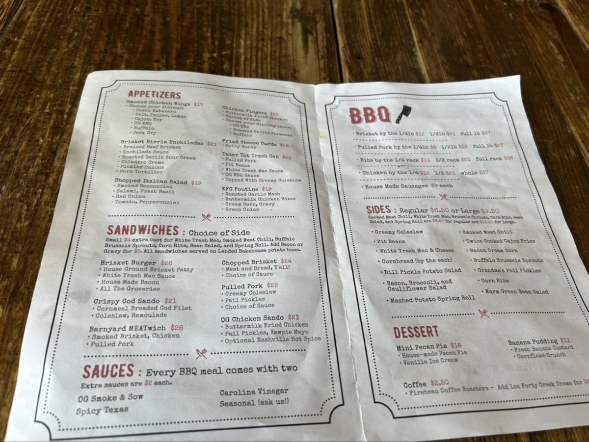 The menu at Smoke & Sow offers a delicious mix of smoked meats, flavorful sides, and refreshing drinks, perfect for a satisfying meal. Starting with appetizers, guests can enjoy Smoked Chicken Wings, Brisket Birria Enchiladas, and a fresh Chopped Italian Salad, alongside comfort food options like Chicken Fingers and Fried Cheese Curds. For sandwiches, the Brisket Burger and Crispy Cod Sando are standout choices, while the Barnyard Meatwich, featuring a combination of Chopped Brisket and Pulled Pork, brings a smoky punch. The BBQ section features hearty portions of Brisket By The 1, Pulled Pork By The 1, Ribs By The 1/4, and tender Chicken By The, as well as House Made Sausages. Sides like Creamy Coleslaw, Pit Beans, and Twice Cooked Cajun Fries complement the main dishes, and the Bacon Cream Corn is a fan favorite. For dessert, indulge in a Mini Pecan Pie or Banana Pudding for a sweet finish. The drinks menu offers local and craft beer options, such as Winterlong Pingo and Yukon Brewing Bohemian Pilsner, along with an assortment of cocktails like the Maple Bourbon Smash and Lavender Collins. Whether you're in the mood for BBQ or a refreshing drink, Smoke & Sow's menu is sure to satisfy every craving.